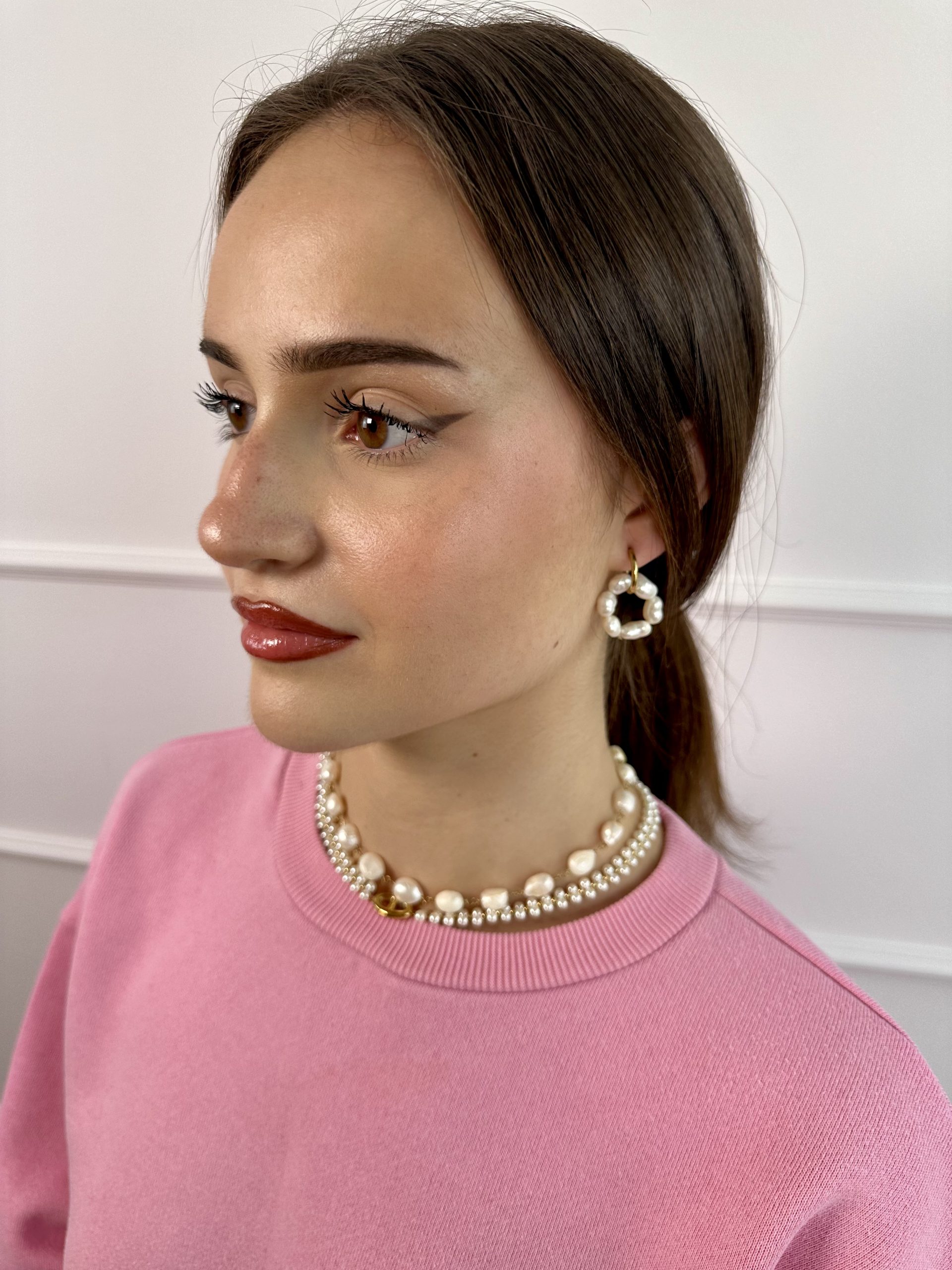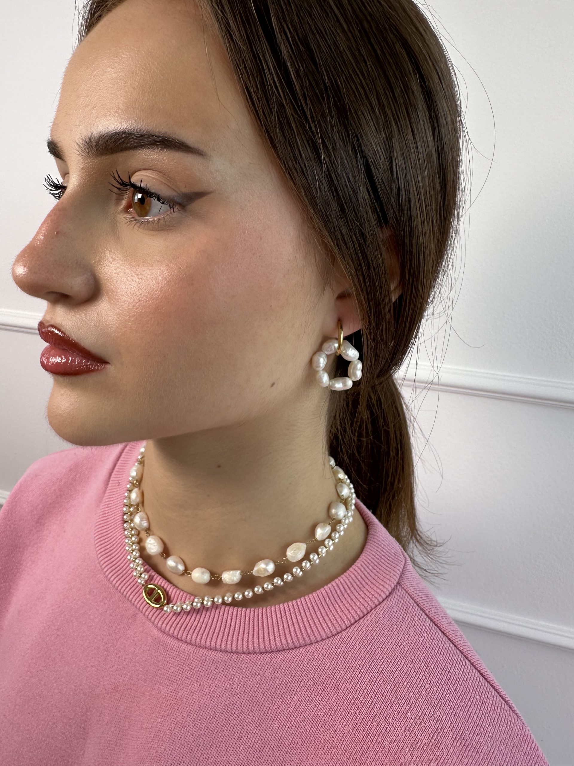 Kolczyki w kształcie koła zdobione perłami w kolorze ecru. Idealnie sprawdzą się jako dodatek do eleganckiego stroju, jak również podkreślą wyjątkowy, codzienny styl. Skład: Stal: 50%, perła: 50%. Kolczyki nie uczulają, dzięki czemu odpowiednie będą także dla alergików i osób z wrażliwą skórą. Typ zapięcia: kreol.