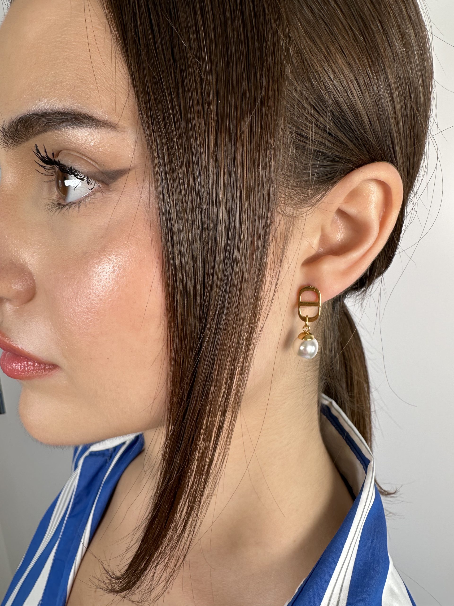 Kolczyki w kolorze złota przyozdobione wiszącą perłą.
